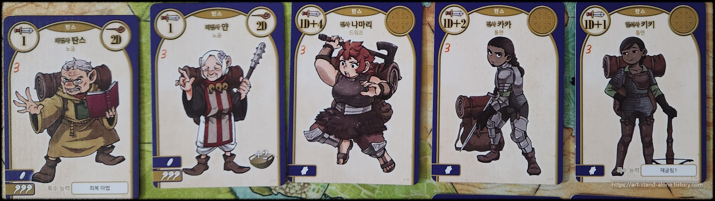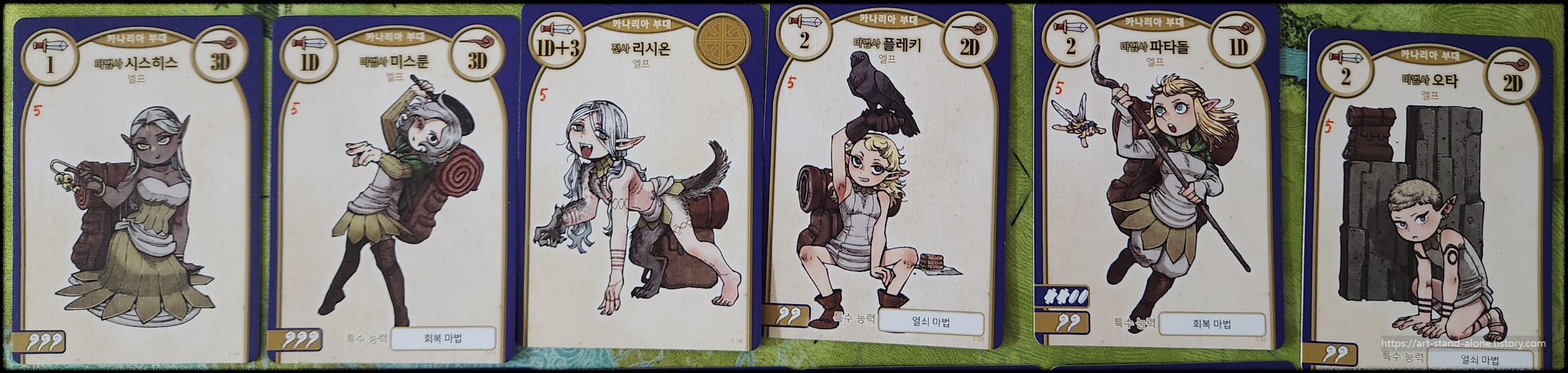 | 휴식 | 순서가 중요하다. 1. 식량 토큰을 사용하여 용사들을 회복 시킨다. 2. 손에 미궁 카드를 5장이 될 때 까지 더미에서 가져온다. 3. 이벤크 카드가 있을 경우 실행 한다. --> 카드를 추가로 뽑지 않는다. 순서가 중요한 이유는 이벤트 카드 때문이다. 이벤크 카드에서 특정 유닛이 필요한 경우가 있는데, 회복을 시키지 않았다면 사용할 수 없다. 또는 식량이 없어서 회복 못했는데, 이벤트 카드로 식량을 받아 회복 하는 것 안된다. |