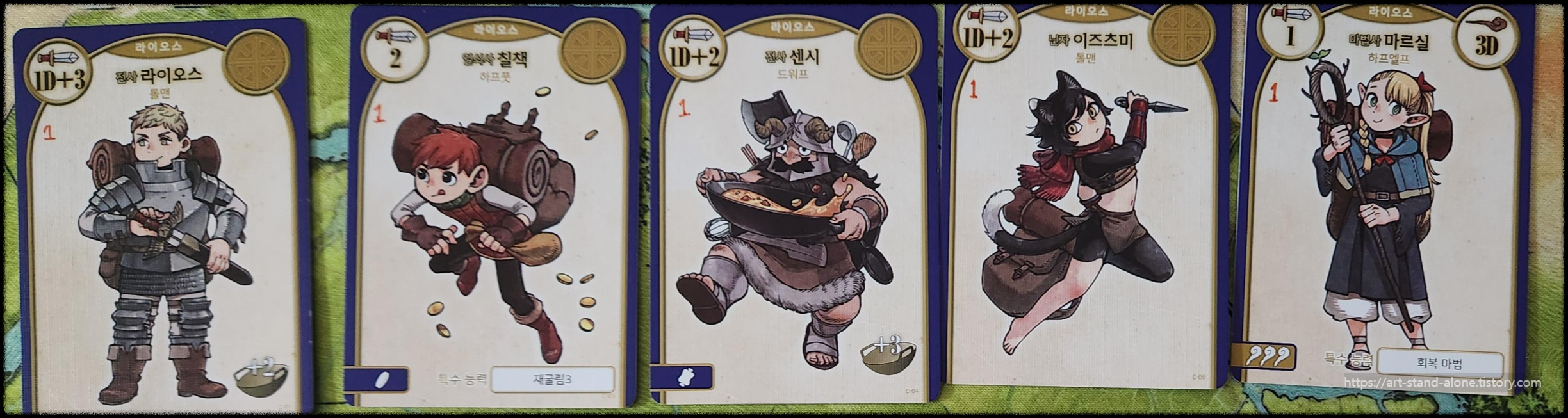 | 재미 | ★ ★ ★ ★ ☆ | 규칙이 약간은 복잡해 보이지만, 상당히 체계가 있다. 애니를 보면 규칙 이해가 더 빠르나 보지 않았다면, 처음 접할 때 이해가 안될 수도 있다. 빨리 달려 보스몹을 잡는다고 이기는 것이 아니다. 고기나 돈을 많이 확보해도 마찬가지. 상대를 견제하면서 내 자원을 관리하면서 던전을 탐험하는 것이 주된 재미. |